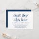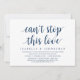 Carte d'invitation de mariage en fuite sur le thème du script bleu marine moderne (Impossible d'arrêter cet amour). Elle est parfaite pour votre dîner de mariage en fuite décontracté au bord du lac, la danse et la fête.