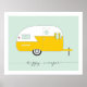Cette impression d'art présente une illustration originale de Charming Ink d'un camper rétro, également connu sous le nom de caravane. La police de script proclame — joyeux camper.