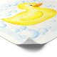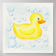 Un mignon canard en caoutchouc jaune entouré de bulles, prêt à encadrer et accrocher sur le mur de votre salle de bain.