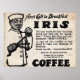Cette impression pour la marque Iris Coffee était une publicité réelle qui est apparue dans le Los Angeles Herald en 1910 et a été numériquement restauré. Il mesure 16" par 12" et peut être agrandi à 20" par 24" et est présenté ici sur le papier d'affiche. Il est recommandé de passer au papier mat lourd en cas d'encadrement. L'annonce indique - Premier appel au petit-déjeuner - IRIS - Personne n'attend le "deuxième, troisième ou dernier appel au petit-déjeuner", où le premier appel annonce "Iris Coffee". Une tasse de café Iris est trop bonne pour prendre des chances de manquer. Pound Tins 40c. - Tins de 3 livres 1,00 $ - Vendu par tous les bons épiciers - Rôti à Los Angeles - Haas Baruch & Co.. — Cette impression serait un grand mur accroché dans n'importe quel café, bistrot, café, comptoir expresso ou toute entreprise qui vend ou rôti du café.