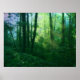 Les rayons du soleil matinal se répandent dans une forêt estivale d'une verdure éclatante, avec des arbres massifs recouverts de lierre et une épaisse couverture de sous-bois. Une photographie numériquement manipulée pour donner aux feuilles de la vigne, de la brume bleu-vert, des rayons dorés et des arbres verts printaniers une qualité de rêve.