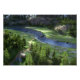 Un sentier sinueux mène au-dessus des montagnes à une vallée de rivière solitaire. Il traverse le ruisseau rocheux sur une ligne de steppes et se termine dans une maison isolée nichée sous les arbres au pied des collines. Le pré de montagne est rempli de l'herbe verte et des taches de fleurs bleues et roses. Les pics ombragés sont encore couverts de neige ce matin de printemps.