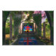 Une ancienne église en pierre se dresse en ruines au milieu de l'herbe et des fleurs d'une colline ensoleillée, mais le vitrail colore toujours la lumière du matin avec le design d'une croix rouge contre un lever de soleil lumineux. Les vieilles arches en pierre sont cassées, mais les branches des arbres en fleurs encadrent la fenêtre.