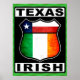 Impression de l'affiche Texas Irish American. Le design irlandais du Texas, dans le style d'un panneau de route cool américain. Le texte Texas Irish est en haut et en bas, avec le drapeau de l'Etat du Texas et le drapeau de la République d'Irlande à l'intérieur du panneau de route. Idéal pour les Texans d'origine irlandaise, et pour les anciens dans l'État Lone Star.