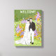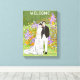 C'est une illustration arrière - plan mariage pleine de chaleur et de bonheur. Sur la photo, un couple marié se tient doucement ensemble, la mariée en robe de mariée élégante et le marié en costume, montrant leur amour profond et leur compréhension tacite. Un chaton blanc accolé aux deux, ajoute à la chaleur et au plaisir de la photo, comme si leur petite famille était pleine d'amour et de vitalité. Dans l'arrière - plan est un jardin coloré avec des fleurs et des plantes violets, oranges et verts, créant une atmosphère rêvée et romantique. Le texte "BIENVENUE" en haut traduit un sentiment d'ouverture et de joie, comme si accueillir les invités à se joindre à la célébration spéciale. Le tableau utilise des lignes simples et des couleurs douces pour express une scène mariage joyeuse, pleine d'attentes et de bénédictions pour un avenir brillant.