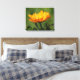 La fleur de calendula orange s'ouvre sur le ciel. Feuilles verts en arrière - plan. Droits d'auteur de l'artiste sur le bord inférieur.