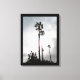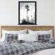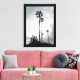 Plusieurs palmiers en silhouette contre un ciel gris orageux. La lumière du soleil qui regarde à travers les nuages rend la lumière à l'image. Le bord de la toile est noir - peut être modifié en modifiant la couleur "arrière - plan".