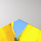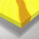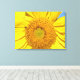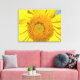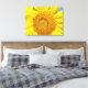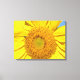 La maison vole sur le pétale du grand tournesol. Le motif géométrique des graines est clairement visible au centre de pétales jaunes brillants. Un peu de ciel bleu est visible aux bords.