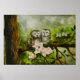 Peinture à l'huile Chouettes pour bébés. Imprimer à vendre. Chouettes aux fleurs roses dans l'arbre.