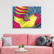 Une belle photo d'une chaussure de clown jaune et rouge et d'une chaussette assortie imprimée sur une toile.