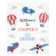 Blue How Time Flies Avion 1er Anniversaire Affiche de bienvenue Bleu, rouge avec une touche de jaune comment le temps vole le signe d'accueil pour un bébé avec des avions, des montgolfières et des nuages.