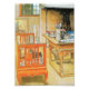 Le bureau de Carl Larsson avec sa petite fille qui regarde à travers les barreaux d'un banc orange. Arrière - plan comprend table avec les artistes brosses et fournitures. C'est une scène de chez l'artiste.