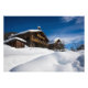 Photographie d'un couple de cabines traditionnels en bois rond ou chalets recouverts de neige sous un ciel bleu dans une station de ski des Alpes en Autriche en hiver.