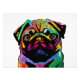 Un imprimé pop art lumineux et coloré d'un chien Carlin sur un arrière - plan blanc.