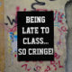 Décor de la salle de classe du collège avec un texte qui dit "Être en retard à la classe... tellement grognon !"
