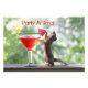 Un écureuil se tient sur ses pattes arrière et boit une boisson tropicale rouge dans un grand verre à martini à travers une paille de parapluie sur cette photo originale. Il y a deux pailles de parapluie dans la boisson. L'écureuil se tient sur une balustrade en bois et l'arrière - plan est planté d'arbres verts. "Animal de fête" est écrit en rouge au-dessus de la tête de l'écureuil. Une drôle d'image d'écureuil qui vous fera rire !