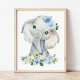 Impression Photo Elephant, Safari, Fleurs Bleues, Garçon Nursery