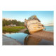 Un navire en bois patiné est partiellement submergé sur une plage de sable à Point Reyes, sa coque inclinée à angle. Les planches en bois du navire sont usées et estompées, montrant des signes d'âge et d'exposition aux éléments. L'eau qui entoure le navire est calme et reflète le ciel bleu et la silhouette du navire. Dans l'arrière - plan, une ligne d'arbres et quelques bâtiments sont visibles, suggérant une ville ou un village côtier.