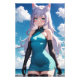 Un personnage captivant aux oreilles de chat avec des serrures d'argent coulantes et des yeux bleus expressifs. Sa robe turquoise moderne et ses gants sombres offrent un contraste élégant avec le ciel dynamique, idéal pour les gravures et les vêtements d'art.
