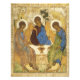 peinture chrétienne médiévale par andre rublev de son interprétation de la trinité avec trois anges avec ailes dorées, halo, vert, rouge, et des manches d'or, assis ensemble autour d'une table. bel art illustratif en or et vert, dans une peinture religieuse délicate et raffinée.