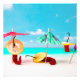Trois piments rouges sur la plage. Chaud jour ensoleillé, mer bleue, sable blanc, parasols et sombreros. Deux poivrons sont noyés sous les parasols de plage, le troisième est lavé au fond de l'eau. Chaque heure est une happy hour à la plage. Soleil, mer, sable, Sombrero. OEuvre murale, affiches, toiles
