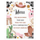 Rustic Pink First Rodeo Birthday Food Menu Sign Bold principalement rose et brun fille rodéo anniversaire repas signe de menu comprenant un casquette cowgirl brun et rose, crâne taureau, cactus, corde, gant cowgirl, bottes et plus.