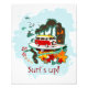 Illustration amusante et moderne d'une scène de plage tropicale avec palmiers, surf océanique avec surfeurs, une belle femme en bikini, de belles fleurs et un vieux bus hippy. Un design parfait pour les amateurs de plage.