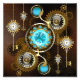 Turquoise lenses with antique watch with brass gears and golden keys on rusty, brown background. Steampunk style.