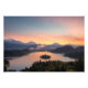Photo d'un lever de soleil coloré sur le lac Bled avec l'île tôt le matin en Slovénie.