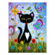 Un chat en tuxedo noir et blanc, assis au milieu de l'herbe et des fleurs dans un jardin coloré. Elle est entourée de fleurs et de formes feuilles et colorées. Elle a les plus beaux yeux verts et porte un collier rouge.