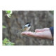 Photo d'une poule noire assise dans la main tendue d'un homme. Le poulet mange une graine de tournesol tirée de la main de l'homme. Une image qui illustre le dicton, "Un oiseau dans la main vaut deux dans la brousse".