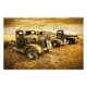 Trois véhicules classiques sont à vendre dans un champ. La vieille texture posée sur la photo crée une sensation vintage de vieux camions et voitures.
