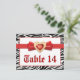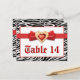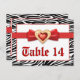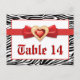Cartes postales en zèbre noir blanc avec arc rouge et bijoux mariage personnalisées numéro de table qui comporte une bordure en zèbre noir et blanc et un ruban rouge à travers avec un arc et un bijou en forme de coeur également en rouge avec contour et strass en or qui ajoute un peu de bling. Notez que l'arc et le bijou de diamant du coeur sont une illustration "imprimée sur" et non un vrai cristal, ainsi le strass. Ce design branché allie éléments modernes et tendance à la police Old English, qui lui donne une touche vintage et rétro. Un design élégant et élégant, parfait non seulement pour un mariage d'hiver.