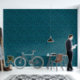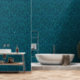 This wallpaper features a pattern of overlapping impressionist brush strokes in shades of navy, teal, turquoise and blue.