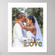 Élégante impression de papier photo de mariage, avec la grande photo de mariage personnalisée comme point focal. Le texte gras en feuille d'or dit Amour, avec les noms de la mariée et du marié, fait en feuille d'or, au-dessus de lui. Personnalisez avec vos noms et votre photo pour une tenue spéciale de votre jour de mariage.