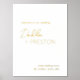 Panneau de bienvenue mariage en feuille d'or de style moderne avec un design simple et minimal avec le nom de la mariée dans un script élégant et le nom du marié dans une police sans serif contemporaine. Vous trouverez ci-dessous, dans le coin inférieur droit, les détails de votre événement. Tout le texte est imprimé avec du papier journal. Un design minimaliste qui s'accorde bien avec n'importe quel style de mariage.