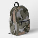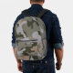 Sac à dos avec motif de camouflage. Les couleurs sont le vert de l'armée, le vert foncé de la forêt, le gris clair et le bronzage. Inclure un nom, en gris, une police désespérée, dans la poche zippée ou supprimer l'exemple de texte.