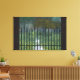 Un paysage en 3D au début de l'automne, représentant un sentier errant à travers l'herbe dans une forêt brumeuse d'arbres anciens et rongés. Mais le chemin surpeuplé est barré par un portail de pointes de fer noir entre des murs de briques foncées. Créé en Vue.