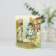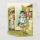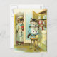 Vintages Kunstwerk von Mutterkatze, das ihr kleines Kätzchen auf einem Hocker aufnimmt und einen Geschmack der Goodies in einem Glas schnappt.