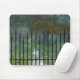 Eine 3D-Landschaft im Frühherbst, die einen Weg darstellt, der durch das Gras wandert, in einen miessigen Wald mit alten und gegrabenen Bäumen. Aber der überwucherte Weg wird durch ein Tor von schwarzen Eisenstangen zwischen dunklen Ziegelmauern versperrt. Erstellt in Vue.