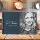 Modernes, einfaches Gästebuch zur Erinnerung an das Foto, um das Leben Ihrer Lieben in einem modernen minimalistischen Design in Marineblau zu feiern. Das Template-Design kann leicht mit Ihrem eigenen Foto und Text personalisiert werden, um eine besondere Hommage an Ihre Lieben oder als Teil ihrer Beerdigung, Gedenkfeier oder Feier des Lebens zu schaffen. Das abgebildete Bild dient nur zur Veranschaulichung, um durch Ihr eigenes Foto ersetzt zu werden. Das Bild der Platzhalter ist eine schöne Frau mit einem scharfen blonden Haar, das eine raue Spitze trägt und in einfarbigen Schwarz-Weiß-Tönen gedreht wird.