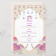 Indian Elegance Dieses zauberhafte Hochzeitsmenü verbindet kulturelle Motive mit einer modernen Ästhetik und schafft ein traditionelles und zeitgenössisches Design. Die Einladung ist in einem sanften, beigen Hintergrund mit zarten Blumenmustern gehalten und symbolisiert Eleganz und Harmonie. Im Mittelpunkt stehen die lebendigen, dekorativen Elefanten, die eine Touch des Kulturerbes und der Festlichkeit in lila und orangefarbenen Tönen hinzufügen. Der verzierte Bogen oben und die blühenden Blumengärten schaffen eine warme und einladende Atmosphäre. Der Script-Schriftart für die Namen verleiht Eleganz, während der klassische Serif-Schriftart eine einfache Lesbarkeit der Details ermöglicht. Ideal für eine Kultur oder Hochzeit in Urlaubsort, erschließt diese Einladung das Wesen von Liebe und Feier. F007