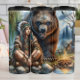 Dieses Bild zeigt eine faszinierende Szene in der Nähe eines sanft rippelnden Stroms in einem entlegenen Teil von New South Wales. Eine junge Frau mit langgestrecktem, gewelltem braunem Haar, die in einer inspirierten Kleidung der Ureinwohner geschmückt ist und mit türkisfarbenen Akzenten eine auffallende Kopfhaut trägt, sitzt auf glatten Flusssteinen. Hinter ihr steht ein massiver brauner Bär mit durchdringenden blauen Augen und sichtbaren Zähnen. Ein kleines Lagerfeuer flackert in der Nähe und strahlt ein warmes Licht aus. Im Hintergrund ist eine rustikale Wohnung inmitten von Bäumen, und ein paar Hirsche grasen friedlich, was die einzigartige Wildnis des Waldbusch erinnert.