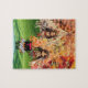 Indische amerikanische Mädchen Camping mit einem Hirsch und Wolfswald Tiere umgeben von bunten Laubbäumen und rosa Blumenzelten.