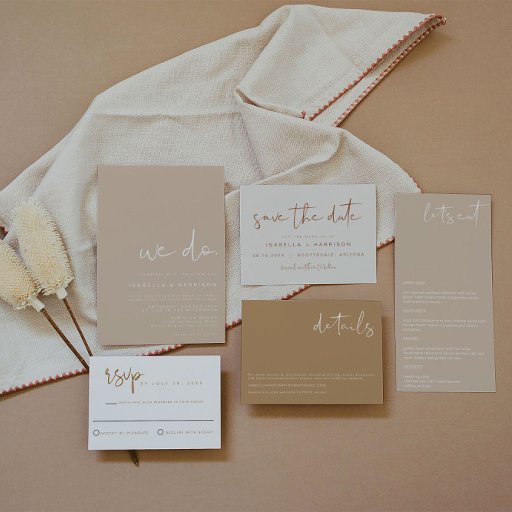 Diese Hochzeitsinklusive bietet einen edlen, handgeschriebenen Schriftart und modernes minimalistisches Design mit böhmisch-beige Taupe. Ändern Sie einfach die Farben und bearbeiten Sie *most*, um den Bedürfnissen Ihrer Veranstaltung gerecht zu werden. Diese Einladung ist perfekt für Ihre zeitgenössische, industrielle oder böhmische Hochzeitsfeier.