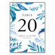 Stilvolle botanische Tischnummern mit Tischnummer, Namen und Hochzeitsdatum inmitten von Aquarellblättern in Indigotönen und aquamarinem Blau. Die eleganten Tischnummern sind so konzipiert, dass sie sich mit unserer Hochzeitskollektion Indigo Blätter abstimmen. Fügen Sie jede Tischnummer einzeln in Ihren Warenkorb.