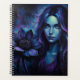 Mystical blue-purple portrait of a luminous woman holding a large dark wildflower, ethereal glow, neon highlights and dreamy fantasy atmosphere.