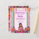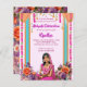Mehndi indische Hochzeitsvorlage Einladung mit einer niedlichen Braut Cartoon Karikatur in rosa Outfit und rosa Blumen.