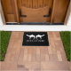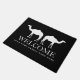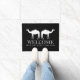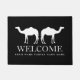 Individuelle Begrüßungstürmatte mit Kameldesign. Schwarz-Weiß-Teppich mit personalisiertem Familiennamen. Elegante Typografie mit moderner tierischer Silhouette. Erhältlich in kleinen und großen Größen. Anpassbare Farben.