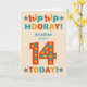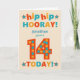 Eine helle und fröhliche Geburtstagskarte, die Sie auf der Vorderseite individuell gestalten können, mit farbenfrohen Buchstaben auf cremefarbenem Hintergrund. Die Titelgrüße ist "angesagt angesagte HOORAY! (Platz, um den Namen hinzuzufügen), du bist 14 Jahre alt TODAY!' in einem kühlen, farbenfrohen Drehbuch. Die rote Nummer 14 ist extra groß und hat große Punkte in goldgelb und grünlich blau. Die Insider-Nachricht ist nur ein Vorschlag, und Sie können sie einfach ändern oder löschen, wenn Sie etwas Anderes oder gar nichts in einer Nachricht drucken möchten.